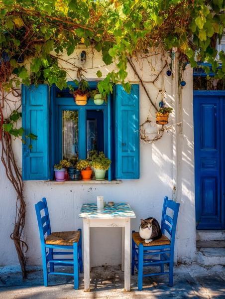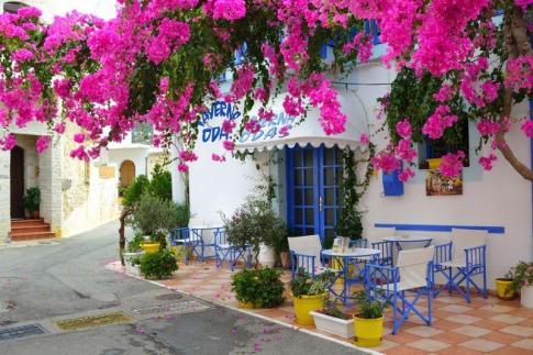 Mália felső, régi részében - Ez a városka legbájosabb része: szűk, kanyargós utcákkal, fehérre meszelt házakkal, kék ajtókkal és ablakokkal, valamint sok helyen virágzó bougainvillea-val, mint a fotón is. Az ilyen kis tavernák – mint például az Odos Odysseas Taverna, amit a képen is látsz – jellemzőek erre a negyedre, ahol sokkal autentikusabb, nyugodtabb a hangulat, mint a tengerparti szórakozónegyedben.- E. M. fotója