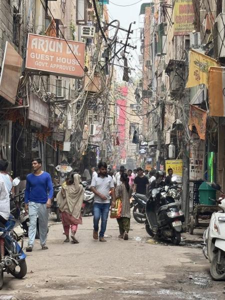 Ez a fotó Újdelhi Paharganj negyedében, a Main Bazar Road környékén készült. Ez a városrész híres a hátizsákos turisták szállásairól (például az Arjun DX Guest House is tipikus vendégház itt), a sűrű elektromos vezetékekről, a zsúfolt utcákról és az olcsó boltok, kávézók, ruhák, ékszerek és éttermek keverékéről. A Paharganj atmoszférája kaotikus, mégis élénk és autentikus — sok utazó számára ez az első igazi „India-élmény” Delhiben. - V. Jancsi fotója