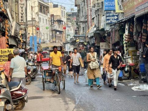Delhi Paharganj városrésze, amely a New Delhi vasútállomás (New Delhi Railway Station) közvetlen közelében található. Paharganj híres a kaotikus utcáiról, színes piacairól, zsúfolt közlekedéséről és az olcsó szállásokról, amelyek miatt a hátizsákos turisták egyik fő központja. - V. Jancsi fotója