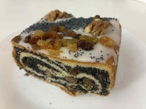 Helyi mákos–mazsolás kalácsféle: sokkal jobban néz ki, mint amilyen az íze — valójában „sima” kalács íze van. - L. Anikó fotója és csemegéje