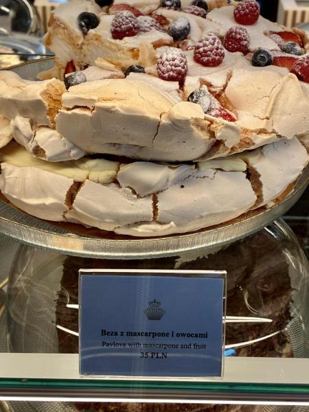 A cukrászdák árai nagyon eltérőek: ez a csoda szép Pavlova-szelet (a szerző egyik kedvence) 9 euróba került. Az átváltáshoz kb. 1 euró = 4 zlotyval lehet számolni. - L. Anikó fotója