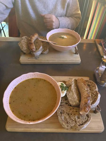 Rozsból készült leves, mellé friss kenyér és kolbász dukál. Igazán tartalmas főétel két séta között! - L. Anikó fotója