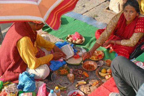 A halottégetési szertartás a Bagmati folyó partján zajlik, amely a Gangeszbe ömlik. Előzetesen több blogbejegyzést is átolvastam, amelyek a sercegő hús hangjáról, valamint az égett haj és köröm szagáról írtak meglehetősen hátborzongató részletességgel, így mindenre felkészülve érkeztünk a csendesen folydogáló folyó mellé. Végül kiderült, hogy a látvány közel sem olyan rémisztő, mint ahogy azt a beszámolók sugallták. A farönkökből összeállított máglya és a közé helyezett szalma teljesen eltakarja a holttestet. A szertartás legvégét – amikor a hamvakat és a parázsló farönköket a folyóba tolják – már nem vártuk meg, de azt a részt igen, amikor a meztelen holttest végtagjait megmossák a Bagmati vízében. Ez európai szemmel egészen bizarr élmény, a hinduk számára viszont annyira természetes, hogy még a gyerekeket is magukkal hozzák a szertartásra.