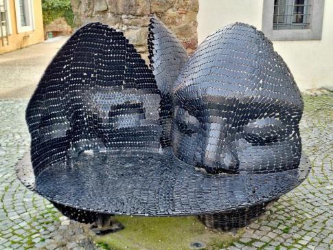 Maribor egyik különleges köztéri installációja, a három arcot formáló fémpad, amely a város művészeti „pad-sétájának” része.K.-T. Gyuri fotója