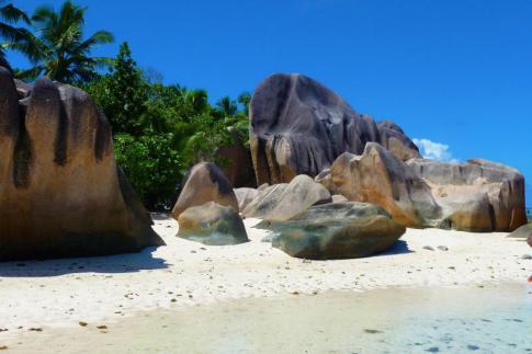 A Seychelle-szigetek partjain látható jellegzetes kövek gránitképződmények, amelyek a világ egyik legrégebbi geológiai formációjának részei. Ezek a sziklák hosszú idő alatt alakultak ki az erózió, a szél, az eső és az óceán hullámai hatására, amelyek finoman lekerekítették és simává tették őket. A gránitsziklák különleges formájuk és színük miatt a Seychelle-szigetek ikonikus tájelemei közé tartoznak, és egyedi látványt nyújtanak a hófehér homokos partokon.