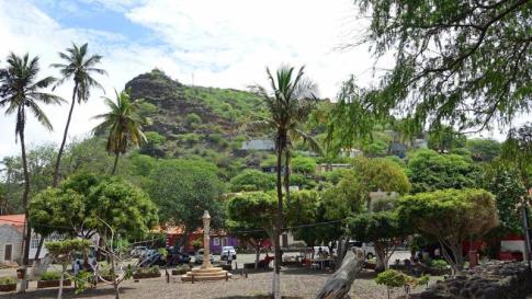 A fotón a Zöld-foki szigetek legnagyobb szigetén, Santiago szigeten, a történelmi jelentőségű Cidade Velha főtere, a Praça Nova / Praça do Pelourinho látható. A tér közepén áll a jellegzetes kőoszlop, a Pelourinho, amely a gyarmati időkben a rabszolgakereskedelem és a nyilvános büntetések szimbóluma volt. A háttérben a zöldellő hegyoldal húzódik, ahol kisebb házak is megfigyelhetők. A környék ma UNESCO Világörökség része, mivel itt volt a portugálok első települése Nyugat-Afrikában, és sokáig a transzatlanti kereskedelem központja. Ez a tér ma békés, árnyas hely, ahol a helyiek és a turisták kávézók, éttermek teraszain üldögélnek, miközben a múlt emlékei még mindig erősen jelen vannak.f.s. fotója