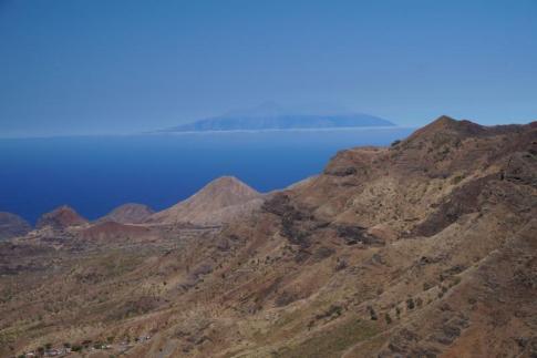 Az előtérben Santiago sziget kopár, hegyes-dombos tájai láthatók, a háttérben pedig a tenger túloldalán felsejlik a Fogo sziget, jellegzetes kúp alakú vulkánjával, a Pico do Fogo csúccsal.