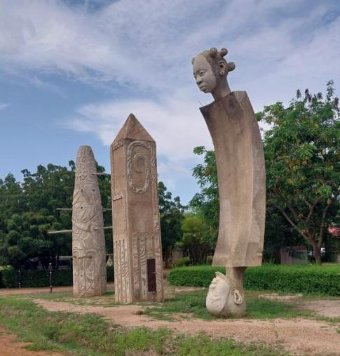 Ez a szoborcsoport Ghána délkeleti részén, a Nkyinkyim Museum szabadtéri szoborparkjában található, Nuhalenya-Ada település közelében, a Greater Accra régióban. A park egy kortárs művészeti és emlékezeti hely, amely az afrikai történelem, különösen a rabszolgaság és az identitás témáit dolgozza fel. Az itt látható monumentális, szimbolikus alkotások az „Ancestor Project” részei, amely az afrikai kontinens múltjának és spirituális örökségének feldolgozását célozza. A képen látható különleges, fejjel lefelé álló figura az elveszett identitás és a gyökereiktől elszakított emberek sorsát jelképezi. - T. K. fotója