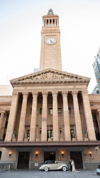 Egy impozáns neoklasszikus épület dominálja a képet hatalmas korinthoszi oszlopaival és klasszikus homlokzatával, amely Brisbane történelmi építészeti örökségének kiemelkedő példája. - B. E fotója