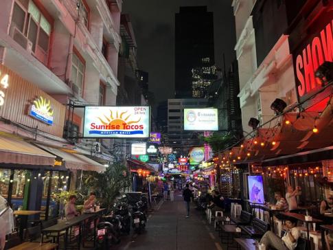 Este kilenc tájban értünk el az utolsó programponthoz, a Soi Cowboy utcához, ahol hiányos öltözetű lánykák és bikinis fiúkák invitálták befelé a kíváncsi turistákat, hogy megnézzék a helyi asztalitenisz szakosztály női csapatának látványos mutatványait. Állítólag…(2023) forrás