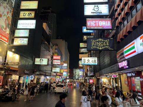 "A turisták még véletlenül sem hagyják ki a vörös lámpás utcák meglátogatását, hiszen puszta szemlélőként is izgalmas, érdekes a hely. Ide a turisták közül a férfiak és a nők is eljönnek kíváncsiságból. A Patpong, a Soi Cowboy és a Nana éjszaka elképesztően mozgalmas. (A Patpong közege amúgy lassan már inkább egy éjszakai piac jellegét ölti, és a prostitúció kezd mellékszállá válni.)" forrás