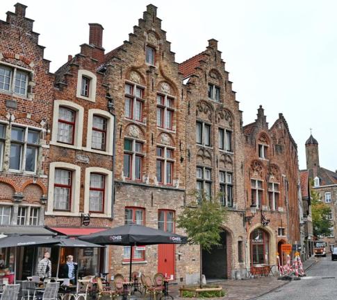 A Vlamingstraat és a Sint-Jakobsstraat környékén. Ez a környék híres a lépcsőzetes oromzatú, középkori flamand házairól, amelyek tökéletesen megőrizték a város 16–17. századi hangulatát. A fotón látható házak egy része ma is lakott, másokban galériák, kisebb butikok, valamint kávézók működnek. Az előtérben lévő utcai terasz például egy tipikus brugge-i kávézóhoz tartozik, míg a háttérben, a szűkebb utcák felé haladva, több helyen antikvitások és csokoládéboltok találhatók. - Elter Karcsi fotója