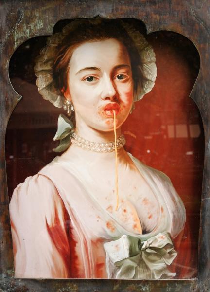 Egy street art jellegű mű Brugge-ben, amelyet sokan lefotóznak, mert provokatív, ironikus és kissé meghökkentő. A kép egy klasszikus, 18. századi stílusban festett nőalakot ábrázol — csipkefőkötővel, gyöngysorral, de egy tésztaszál lóg ki a szájából. Ez a szándékosan disszonáns, groteszk hatás tipikus a modern belga utcai művészetre, amely gyakran játszik a „magas művészet” és a hétköznapi élet humoros ütköztetésével. A hasonló képek Brugge-ben több étterem, kávézó és galéria kirakatában is feltűnnek, főleg a Sint-Amandsstraat és a Breidelstraat környékén, ahol a város modern művészei előszeretettel állítanak ki meghökkentő, gasztronómiai utalású műveket.