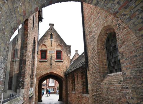 A képen látható boltíves átjáró az egykori középkori kórházkomplexum része, amely ma múzeumként (Sint-Janshospitaal Museum) működik, közvetlenül a De Halve Maan sörfőzde és a Minnewater-csatorna közelében. A kórház a 12. században épült, és Európa egyik legősibb fennmaradt kórháza. A belső terekben ma Hieronymus Bosch és Hans Memling híres oltárképei láthatók, amelyek eredetileg is az itteni kápolna díszei voltak. A fotón jól látszanak a jellegzetes vörös ablakkeretek és gótikus boltívek, amelyek Brugge történelmi építészetének tipikus elemei. - Elter Karcsi fotója