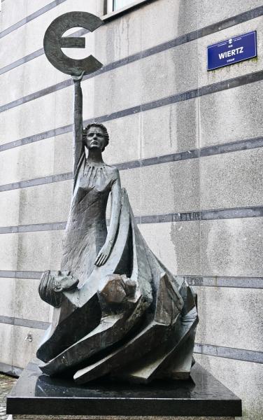Ez a szobor az Európai Parlament közelében áll- „A béke Európája” (The Europe of Peace) címet viseli. A nőalak magasba emelt kezében az euró jelképével. - Elter Karcsi fotója