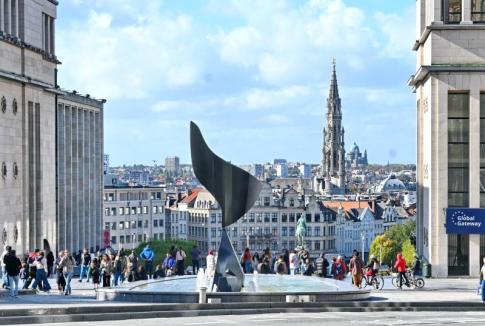 Ez a fotó a Mont des Arts (Kunstberg) teraszáról készült, ahonnan az egyik legszebb panoráma nyílik a városra. Középen látható a modern szobor és szökőkút, a háttérben pedig jól kivehető a Grand-Place városházájának tornya. - Elter Karcsi fotója