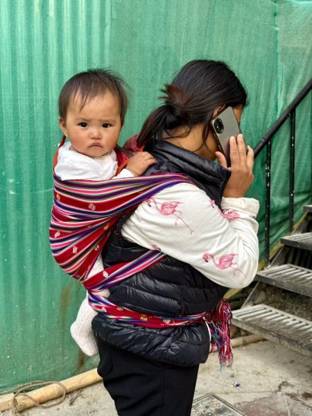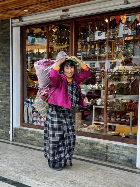 Bhutánban a nők – különösen vidékről érkezve – gyakran hordják így a portékájukat, amikor a fővárosba jönnek eladni vagy bevásárolni. A zsákban lehet gyapjú, takaró, zöldség, szárított chili, vajkő, vagy akár kézzel szőtt kelme is, hiszen ezek mind gyakori árucikkek a thimphui piacon. A színes zsineggel a homlokához rögzített teherhordás módja hagyományos himalájai technika, amit ma is sokan használnak a mindennapokban – különösen olyan helyeken, ahol meredek utcák és lépcsők nehezítik a közlekedést. - V. Jancsi fotója
