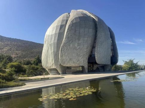 Ez a különleges épület a Bahá'í Templom (Templo Bahá'í de Sudamérica), amely Santiago de Chile külterületén, Peñalolén városrészben található. A templom a Cordillera-hegység lábánál áll, és a jellegzetes, „szirmokra” emlékeztető formájával Chile egyik legmodernebb és legikonikusabb építészeti látványossága. - B. O. fotója