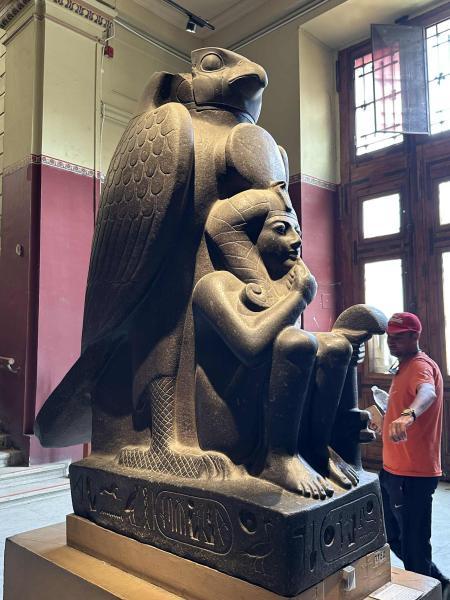 Ez a szobor Hórusz isten és egy III. Ramszesz fáraó közös ábrázolása, és a múzeum egyik híres alkotása. A mű fekete gránitból készült, és az Újbirodalom idejéből (Kr. e. 12. század körül) származik. A szobron Hórusz — a sólyomfejű égisten, a királyi hatalom és védelem jelképe — védelmezően a fáraó mögött áll, szárnyait köré terjeszti. - K. Kriszta fotója