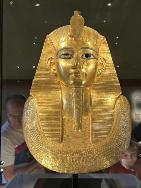 Ez az arany halotti maszk Psusennesz I. fáraóhoz (más néven Psusennesz I. vagy Pasebakhaenniut I.) tartozik, aki az XXI. dinasztia idején, Kr. e. 1047–1001 között uralkodott. A maszk a taniszi királysírból került elő, és ma a múzeum egyik legértékesebb aranylelete. - K. Kriszta fotója