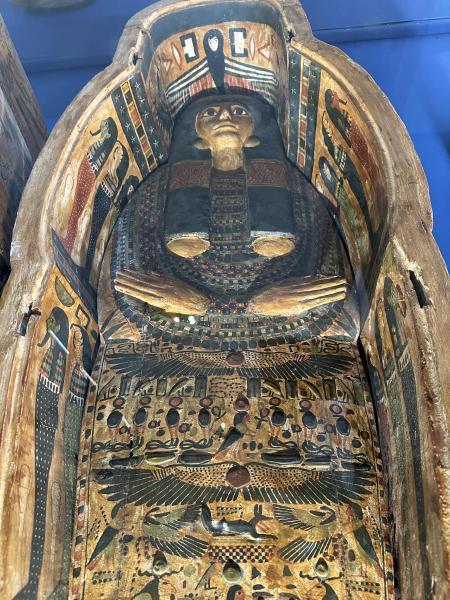 Egy festett egyiptomi koporsó belső oldala, a Középbirodalom vége vagy az Újbirodalom (Kr. e. 11–9. század) idejéből. Ilyen díszítésű koporsókat gyakran papok, írnokok vagy nemesi rangú személyek számára készítettek. A fotó nagyon hasonlít a Theban (Thébai) koporsók stílusára, amelyekből több is látható ebben a múzeumban.- K. Kriszta fotója