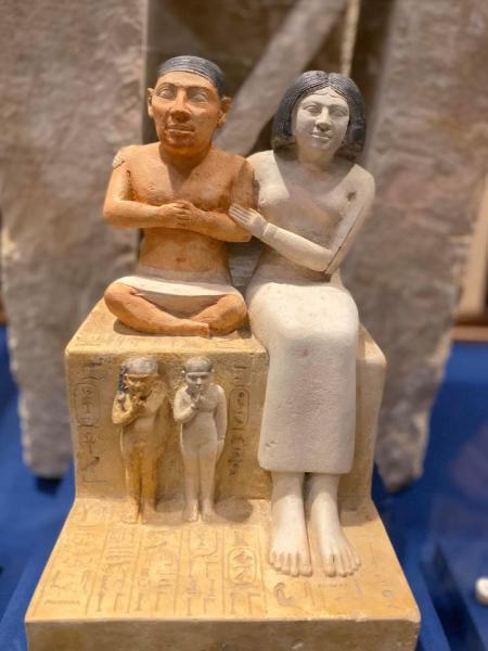 Ez a híres Rahotep és Nofret szoborcsoportja, az ókori Egyiptom IV. dinasztiájának idejéből (kb. i. e. 2600 körül), amely a Kairói Egyiptomi Múzeum egyik legértékesebb darabja. A szobrokat 1871-ben találták meg Meidumban, Rahotep sírjában. Rahotep valószínűleg Széphrén fáraó testvére volt, és magas rangú tisztviselőként szolgált — a címei között szerepelt a „király fia”, „hadvezér” és „Héliopolisz főpapja”. Mellette ül felesége, Nofret, akinek neve azt jelenti: „A szépséges”.