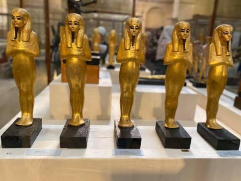 A képen látható, 2025 óta azonban már a Nagy Egyiptomi Múzeumban látható aranyozott szobrocskák az Egyiptomi Múzeum (Kairó) gyűjteményéhez tartoznak, és Tutanhamon sírjából (KV62, Királyok Völgye) származnak. Ezek a kanópuszláda őrzőszobrai vagy más néven védőistenségek (Hórusz-fiak) alakjai.