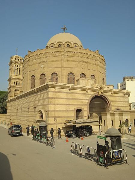 Ez az épület a Szent György-templom (Greek Orthodox Church of St. George), amely Kairó kopt negyedében található. Ez a kör alaprajzú, bizánci stílusú templom az egyik legrégebbi keresztény templom Egyiptomban, és a görög ortodox közösség legfontosabb szent helyei közé tartozik. A mai formáját a 10. században nyerte el, miután a korábbi, római erődmaradványokra épült templomot többször is újjáépítették. A templom belsejében különösen értékesek a szentképek és a fából faragott ikonok, amelyek közül néhány több száz éves. A helyet ma is aktívan használják, és gyakran tartanak itt keresztény ünnepeket és zarándoklatokat. A templom a Kairói kopt negyed (Coptic Cairo) egyik legfontosabb látnivalója, közvetlenül a római Babilon-erőd falainál. - Ata fotója