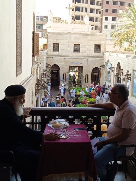 Ez a fotó a Lógó templom (Hanging Church / El Muallaqa) erkélyéről készült:Eegy kopt pap és egy látogató látható beszélgetés közben, az erkélyen elhelyezett asztalnál, amelyen keresztet és imafüzért is észre lehet venni. Az erkélyről a templom belső udvara látszik, ahová a látogatók a főkapun keresztül lépnek be — ez az udvar vezet a templom bejáratához. Az alul látható lépcsősor a templom híres feljárata, amelyről a hely az „El Muallaqa”, vagyis „függő templom” nevet kapta, mivel a szentély a római Babiloni-erőd falai fölé épült. - Ata fotója