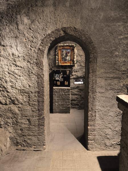 Ez a fotó a Szent Sergius és Bacchus templom (arab nevén Abu Szerga) altemplomát ábrázolja Kairó kopt negyedében. Ez az egyik legősibb keresztény templom Egyiptomban, a 4–5. században épült, és különösen fontos a keresztény hagyományban, mert a hagyomány szerint itt húzódott meg a Szent Család (Jézus, Mária és József), amikor Egyiptomba menekültek Heródes üldözése elől. A képen látható altemplom – vagyis a barlangszerű kripta – azt a helyet jelképezi, ahol a Szent Család menedéket talált. A sziklából vájt falak és a keskeny átjáró hitelesen idézik meg az ókori helyszínt. A kis oltár fölött ikon látható, amely Jézust és Máriát ábrázolja, körülötte hívők által elhelyezett képekkel és ajándékokkal. - N. L. fotója