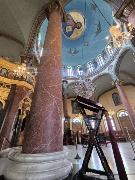 A templom hatalmas kupolája, amelynek belsejét Krisztus Pantokrátor (a „Világbíró Krisztus”) ikonja díszíti – ez a bizánci templomok jellegzetes motívuma. A kupola alatti márványoszlopok vörös és zöld erezetűek, és a 20. század elején végzett újjáépítés során kerültek a helyükre, amikor a templomot teljesen felújították. - N. L. fotója