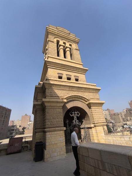 A templom hatangtornya a templom bejáratához vezető híd mellett található, kissé megemelt szinten — hiszen a templom a régi Babiloni-erőd egyik kaputornyának tetejére épült, innen ered a neve is („Lógó templom”). A kőtorony a 19. század végi restaurálás során épült, és harmonizál az egész templomegyüttes aranyszínű mészkő homlokzatával. - N. L. fotója
