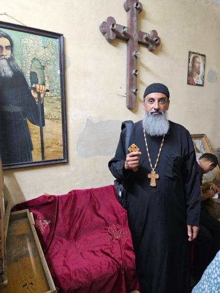 Egy kopt ortodox pap, aki a Szent Sergius és Bacchus-templomban (Abu Sarga) szolgál. A kezében hagyományos fából faragott keresztet tart, amely a kopt keresztény hit egyik legfontosabb szimbóluma. A falon mögötte egy sivatagi szerzetest ábrázoló kép látható, utalva a kopt szerzetesség ősi hagyományaira, amelyek Egyiptomból indultak ki. - F. L. fotója