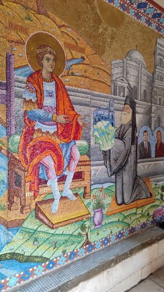 A színes mozaikon Szent György (bal oldalon, glóriával) látható, amint egy szerzetes vagy pátriárka tiszteleg előtte, és felajánlást nyújt át neki — tipikus ikonográfiai jelenet a kolostor udvarában és a lépcsőknél található mozaikok között. - P. G. fotója