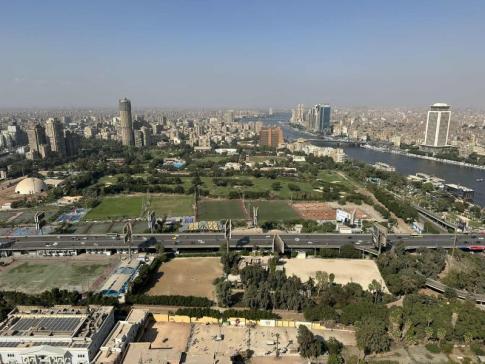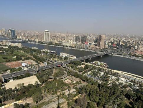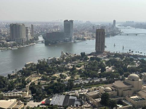 Ez a fotó szintén a Kairói Torony kilátójából készült, a Nílus déli irányába tekintve. Az előtérben látható nagy, világos színű épületegyüttes a Kairói Operaház (Cairo Opera House), amely a Gezira-szigeten (Zamalek) található, közvetlenül a torony szomszédságában. A folyó túloldalán, középen a Hotel Sofitel Cairo Nile El Gezirah henger alakú, ikonikus toronyépülete áll, amely egy kis félszigeten nyúlik be a Nílusba. Balra tőle, a folyó két ága között fekvő rész a Roda-sziget (Rawda Island), rajta a Manial Palota kertjeivel és a híres Nilométerrel (Nileometer). - K. Kriszta fotója