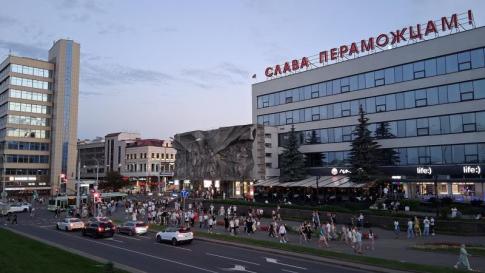 Minszk belvárosában, a Győzelem tér (Плошча Перамогі / Ploshcha Peramohi) közelében - A nagy piros betűkkel kiírt felirat a ház tetején belarusz nyelven ez: СЛАВА ПЕРАМОЖЦАМ! - Magyarul a jelentése: „Dicsőség a győzteseknek!” - Ez a szovjet időkből származó jelszó, amely a második világháborúban aratott győzelemre utal, és Minszk több pontján is látható különböző formában. - D. P. fotója