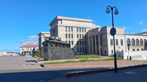 Minszkben a Belorusz Hadsereg Drámai Színháza (Драматический театр Белорусской Армии), előtte pedig egy emlékmű: egy T–34-es szovjet harckocsi állványra helyezve. - D. P. fotója