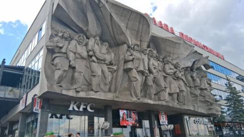 Oroszországban nincs KFC, mert a márkát kivonták, és helyi lánc váltotta fel. Belaruszban van KFC, mert ott a nyugati cégek egy része nem lépett ki, és a franchise megmaradt. - Persze a KCS homlokzata fölötti dombormű szivjet örökség - D. P. fotója