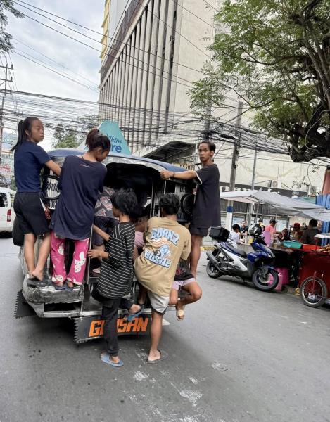 A manilai forgalom egyszerűen pokoli – Budapest ehhez képest nyugodt kisvárosnak tűnik. Itt tényleg van ok a panaszkodásra: órákba telhet, mire az ember egyik kerületből a másikba jut, így sokszor a gyaloglás a leggyorsabb és legkiszámíthatóbb megoldás. Az utcákon rengeteg a híres jeepney, ezek a nyitott, színesre festett kisbuszok, amelyekre 10–15 ember fér fel. Nincs két egyforma darab, mindegyik egy kis mozgó műalkotás, az oldalára pedig mindig rá van írva az útvonal. Utazni velük olcsó, de zsúfolt és meglehetősen kaotikus élmény. A másik jellemző jármű a tricikli – egy motorra szerelt fémből készült oldalkabin, amellyel akár négy-öt embert is képesek elszállítani. Néha egészen elképesztő, hogy mennyien préselődnek fel egy-egy járatra.A manilaiak viszont meglepően ápoltak és igényesek: férfiakat és nőket egyaránt mindig tisztán, csinosan öltözve látni, noha az átlagmagasság alig 150 centi körül mozog. Az utcák állandóan nyüzsögnek, a legnagyobb tömeg pedig dél körül gyűlik össze, amikor mindenki egyszerre megy ebédelni. Pontban délben az egész város lelassul: az irodák kiürülnek, az üzletek ritkábban kiszolgálnak, mert ilyenkor az ebéd szent dolog – ha félbe kell hagyni valamit miatta, hát legyen.