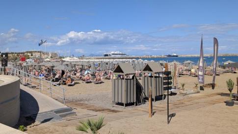 Nagyon megkedveltem ezt a strandot. Hatalmas, szélesen elnyúló partszakasz, finom homokkal, csak a vízbe lépésnél akad némi apró kavics, de semmi zavaró. A kedvenc napágyas részemnél mindig tiszta volt a mosdó és a zuhanyzó, ráadásul mindezért külön nem kellett fizetni – ritka kényelem egy forró nyári napon.