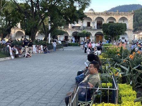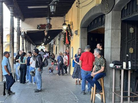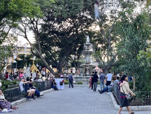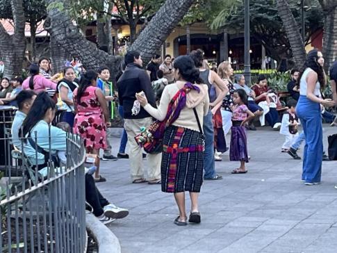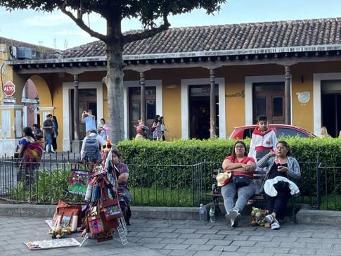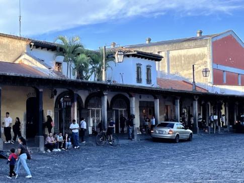 A Parque Central árkádjai alatt guatemalai kávét kortyolgatn.