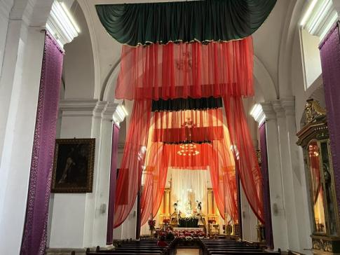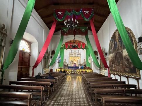 A guatemalai templomokban az ilyen színes lepel- és textildíszítés a liturgikus időszakokat (ilyen pl. a karácsonyt megelőző időszak is) jelzi, amikor a színeknek szimbolikus jelentésük van. - K. Kriszta fotója