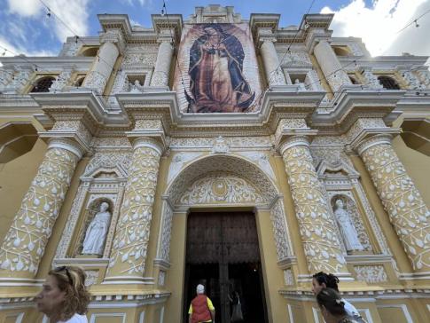 A templom homlokzata a guatemalai barokk stílus egyik legkifinomultabb példája. A sárga alapszínt fehér stukkódíszek és faragványok ékesítik, amelyek között növényi motívumok, virágok és vallási szimbólumok találhatók. A homlokzat központi elemét a Szűzanya szobra díszíti. A két oldalon elhelyezkedő alacsony tornyok harmonikus egyensúlyt kölcsönöznek az épületnek.
