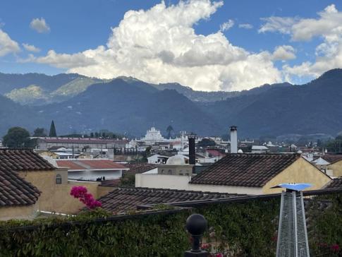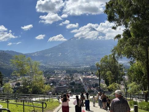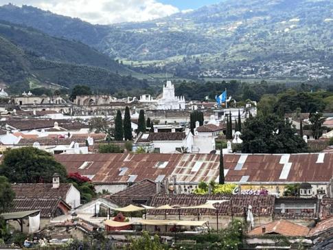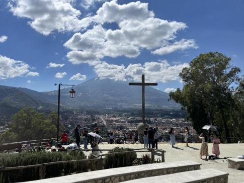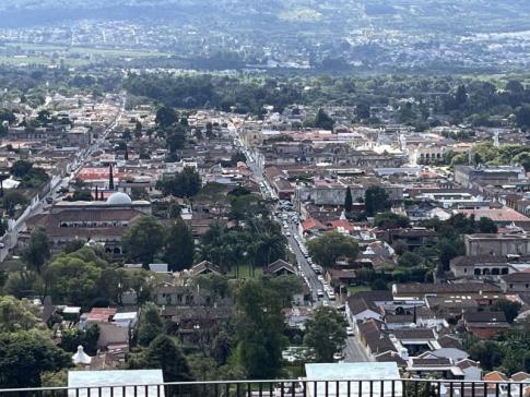 A Cerro de la Cruz kilátóhelyéről nyíló panoráma valóban szép. Innen szinte a teljes város látható, sakktáblaszerű utcahálózatával, sárga-fehér koloniális épületeivel és számos templomtornyával. A város mögött az impozáns Agua vulkán uralja a látképet, amelynek tökéletes kúp alakú sziluettje különösen fotogén. Tiszta napokon a Fuego és Acatenango vulkánok is láthatók a távolban.