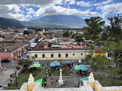 A templomok látogatása mellett megnéztem a piacot is, ami vasárnap eléggé csendes volt, és felmásztam a Cerro de la Cruz-ra, ahonnan az egész várost belátni, a háttérben az Agua-vulkánnal.