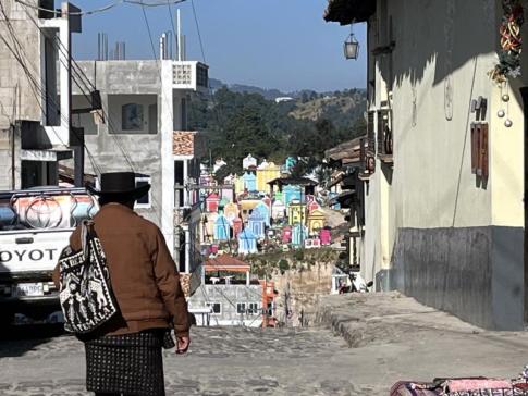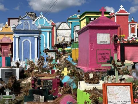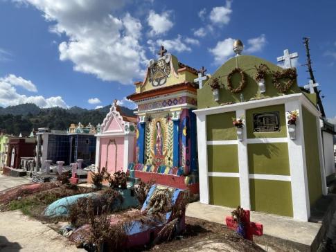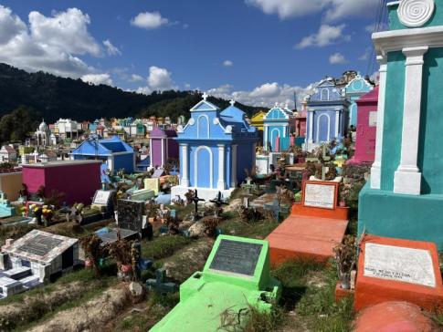 Chichicastenango temetője szintén figyelemre méltó. Bár a város maga egyszerű, szürke, vakolatlan betonházakból épült, a temető élénk színekben pompázik: a sírok és kripták kék, rózsaszín, zöld, sárga árnyalatokban sorakoznak egymás mellett. Úgy tűnik, a maják számára a halottak tisztelete és jóléte legalább olyan fontos, mint az élőké. Egyes kripták szinte kis palotáknak hatnak, díszesen, szeretettel karbantartva. Gyakran látni családokat, akik ételt, italt és tömjént visznek a sírokhoz, és nyugodtan beszélgetnek elhunyt szeretteikkel – ahogy ősi hitük szerint a halottak lelke továbbra is jelen van az élők világában.