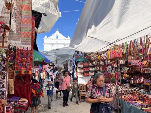 A vasárnapi piac színkavalkádja lenyűgöző volt, ahol a helyiek hagyományos huipil viseletükben árulták kézműves termékeiket.