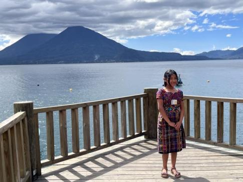 A guatemalai kislány hagyományos maja viseletet hord: színes, kézzel szőtt huipilt (felsőruhát) és cortét (szoknyát), amelyet mintás öv, faja fog össze. Ezek a ruhák nem jelmezek, hanem ma is élő, mindennapi viseletek, amelyek a viselő közösségének és régiójának jellegzetes motívumait hordozzák. - K. Kriszta fotója