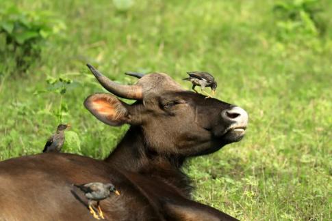 Egy fiatal gaur (más néven indiai bivaly) ingyen kullancseltávolító kezelést kap egy csapat erdei seregélytől.