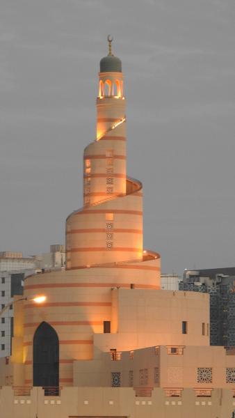 Ez a Fanar – Qatar Islamic Cultural Center ikonikus spirálminaretje, Doha belvárosában. A jellegzetes csavart formájáról azonnal felismerhető: a spirál a 9. századi szamarrai Nagy Mecset minaretjére utal, amely Irakban található. A Fanar egy kulturális és vallási központ, nem klasszikus mecset, de imaterem is működik benne, és nagyon gyakran látható Doha látképein.